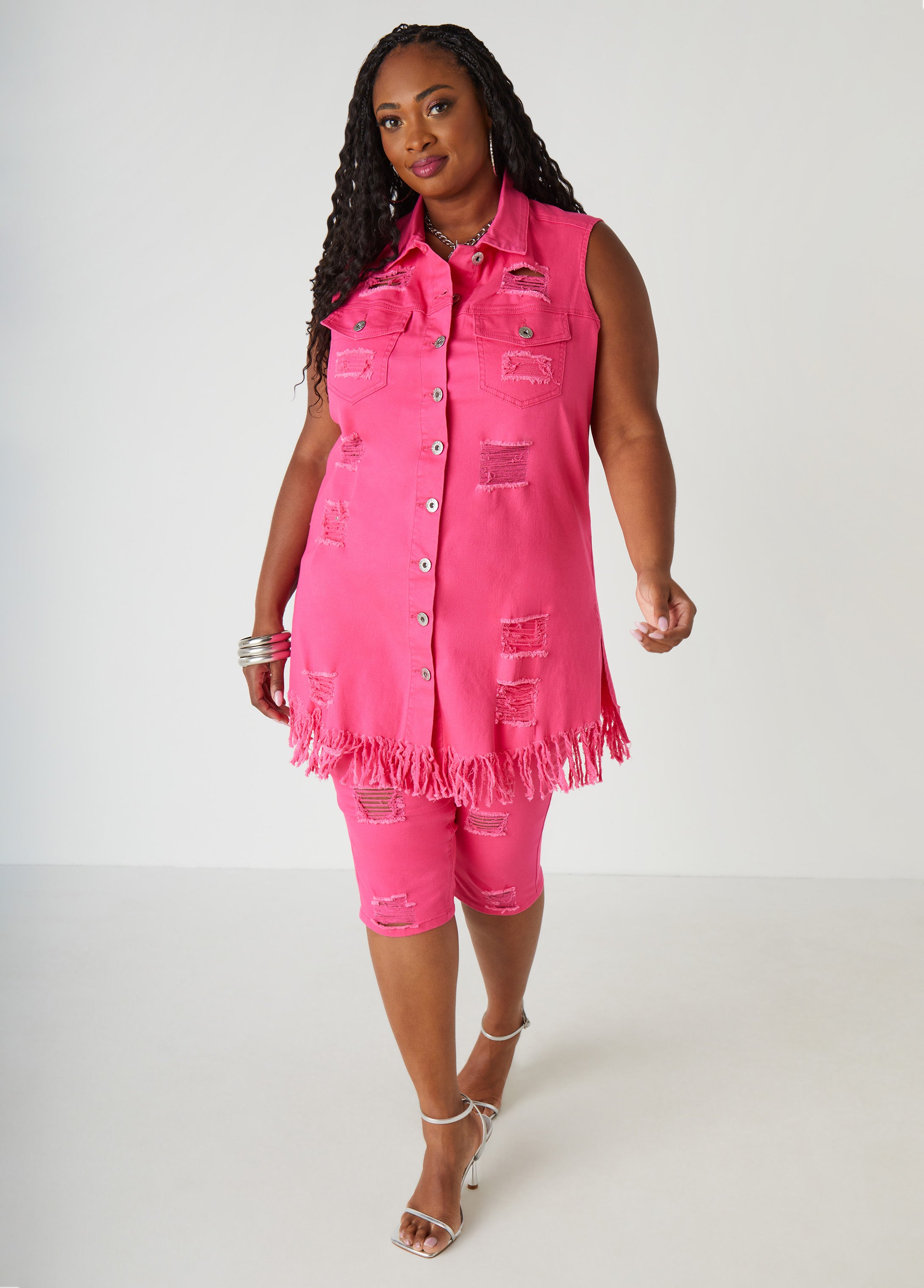 Once you see how incredible you look in our distressed vest, you'll be wondering how you lived without out! Okay, a little dramatic, but made from soft stretch-denim, the over-the-top distressing detailing is #BigBaddieEnergy.
